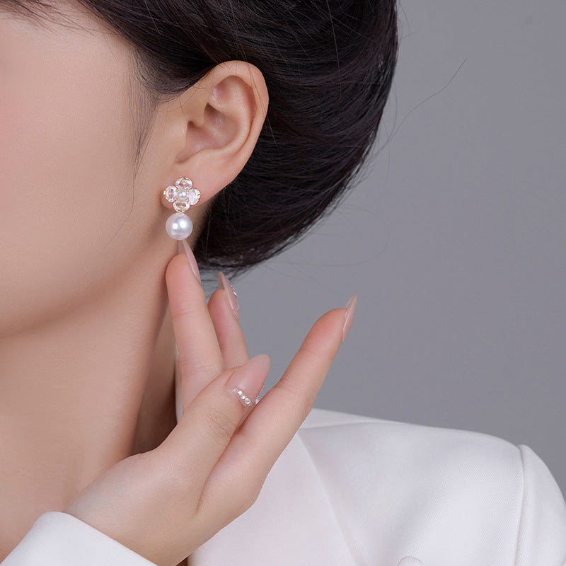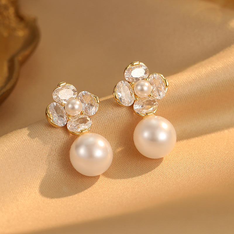 S925 Silver Needle Flower Pearl Earrings: Diamond Inlaid, Gentle, Versatile